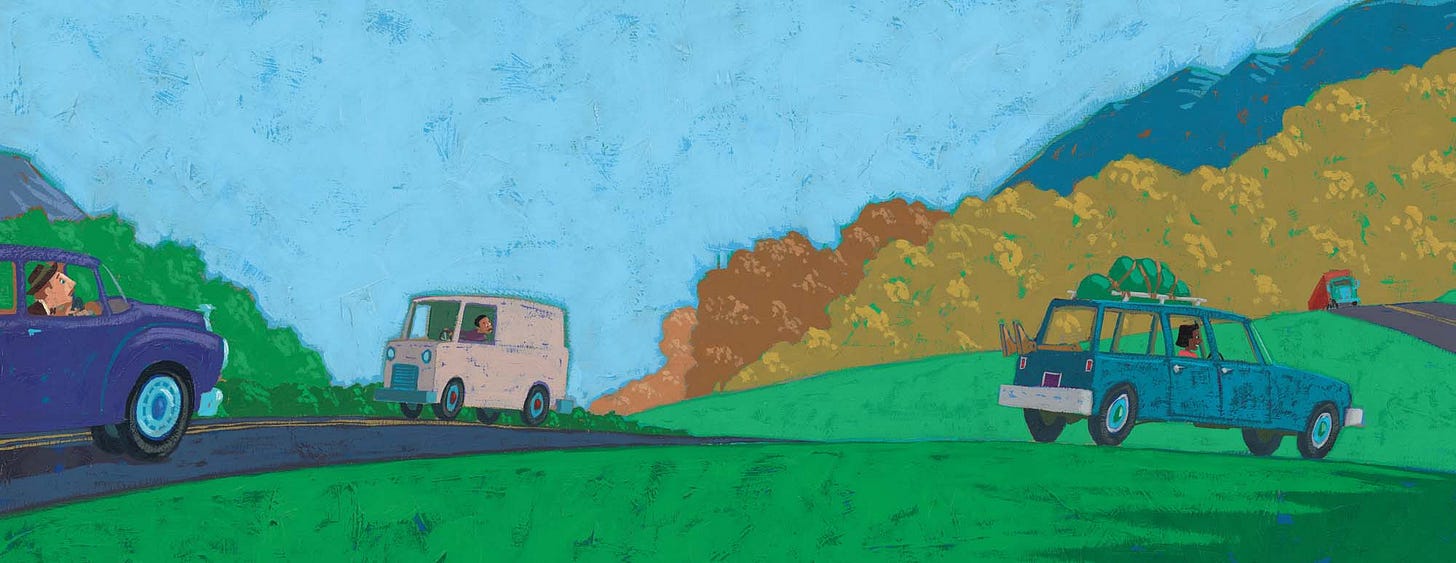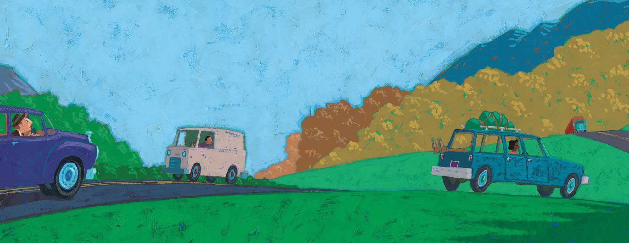 Here’s one of my favorite pictures from OLIVER. They are traveling down I-40, going across Arkansas. (See Oliver in the back of the old station wagon? When I visit schools in Arkansas, I point to the hill behind the car and ask, “Do you know what is right behind that hill?