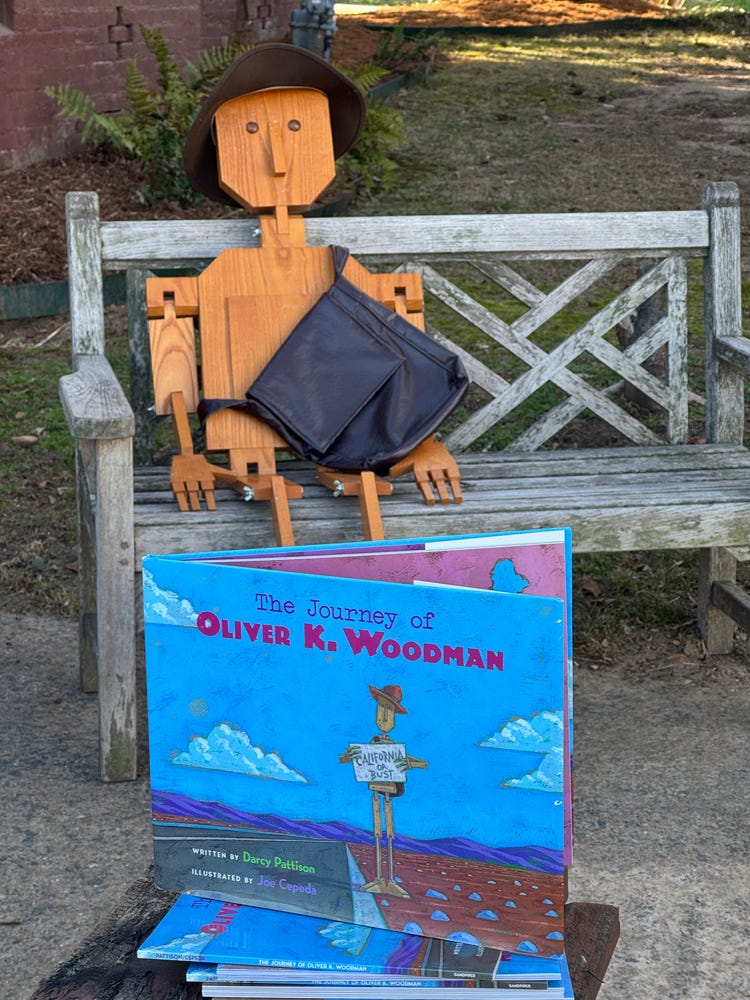I pulled out that old story about the wooden man and a huge map of the U.S. In an afternoon, I wrote the story of Oliver K. Woodman, a wooden man who travels across the U.S. to unite a family. The story is told in letters written by someone who gives Oliver a ride. The story, illustrated by Joe Cepeda, was a Irma Black Honor book, starred Kirkus and BCCB, among other awards.
